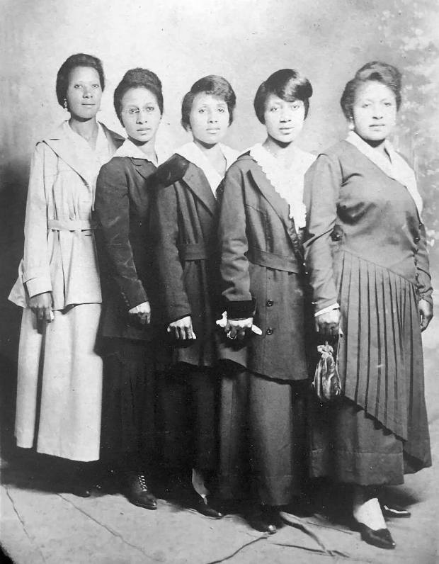 Photo of five New York sisters from a family estate, names now sadly lost. A great example of daytime fashion in the teens – you can really see the loose fit in their walking suits that would evolve into the loose-fitting 1920s gowns in the next decade. Hemlines are a bit higher, and the lady in front is wearing spats over her boots. You can get a decent look at her bag. Some good views of 1910s hairstyles for Black American women.