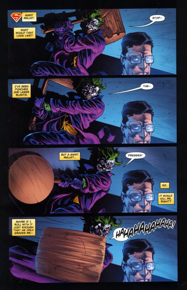 but then here comes the Joker with a comically large wooden mallet and now Clark has to figure out how Normal Human Man Clark Kent could conceivably survive this without making it obvious that he is not actually a Normal Human Man. just “oh goddammit i’ve never even seen someone get hit with one of these before, the joker’s probably seen all kinds of people get hit, he knows what this is supposed to look like but i have no goddamn idea i am so fucked”