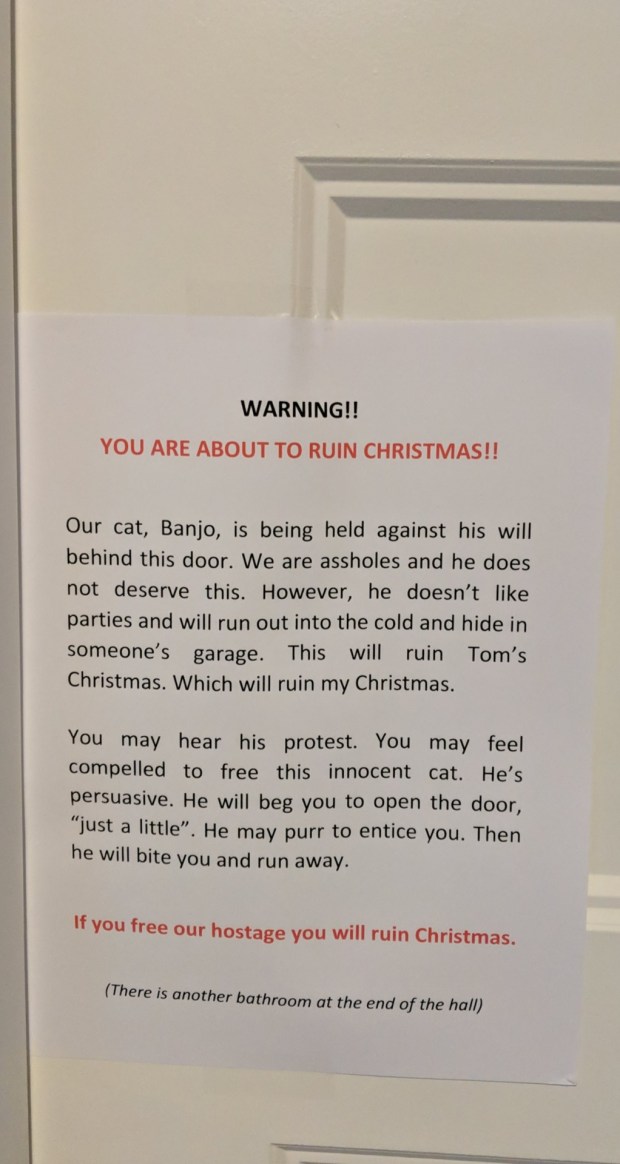 My parents have a “Festivus” party every year and this year I found this sign on their bedroom door