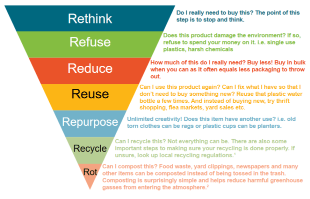 Can I use this product again? Can I fix what I have so that I don’t need to buy something new? Reuse that plastic water bottle a few times. And instead of buying new, try thrift shopping, flea markets, yard sales etc.- Repurpose- Unlimited creativity! Does this item have another use? i.e. old torn clothes can be rags or plastic cups can be planters.