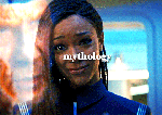 ST:DSC’s Cmdr. Michael Burnham, smiling tearfully at something or someone behind the camera position; text “mythology”;