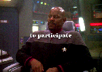 ST:DS9’s Capt. Benjamin Sisko, seated in the Defiant’s command chair, lacing his fingers together contemplatively; text “to participate”;