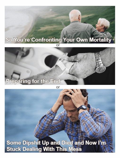 shitThis is an eighteen page book that you can print out, download, share, and give away; it is meant to be used to collect information about funeral planning and account management after a death OR you can use it BEFORE you die and give people information so they’re not stuck playing Nancy Fucking Drew while trying to keep seventeen cousins who crawled out of the woodwork from gutting each other in front of the fucking casket as they argue about who’s inheriting grandma’s favorite dentures.