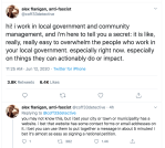 [ID: Two screenshots of a twitter thread by alex flanigan, anti-fascist @Coff33Detective from June 12, 2020 beginning at 11:25 AM that reads: hi! i work in local government and community management, and i’m here to tell you a secret: it is like, really, really easy to overwhelm the people who work in your local government. especially right now. especially on things they can actionably do or impact.