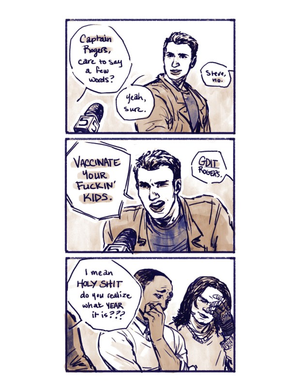 Okay but imagine the savvy pediatrician who shyly sends Steve a message at Avengers Tower. She loves his message. Loves it. Wants to know if she can give her vaccinated kids a sticker of the shield because she wants other parents to subtly get the message, and of course what kid doesn’t love Cap? She’s no graphic artist, but she got a picture of the shield off the Internet …